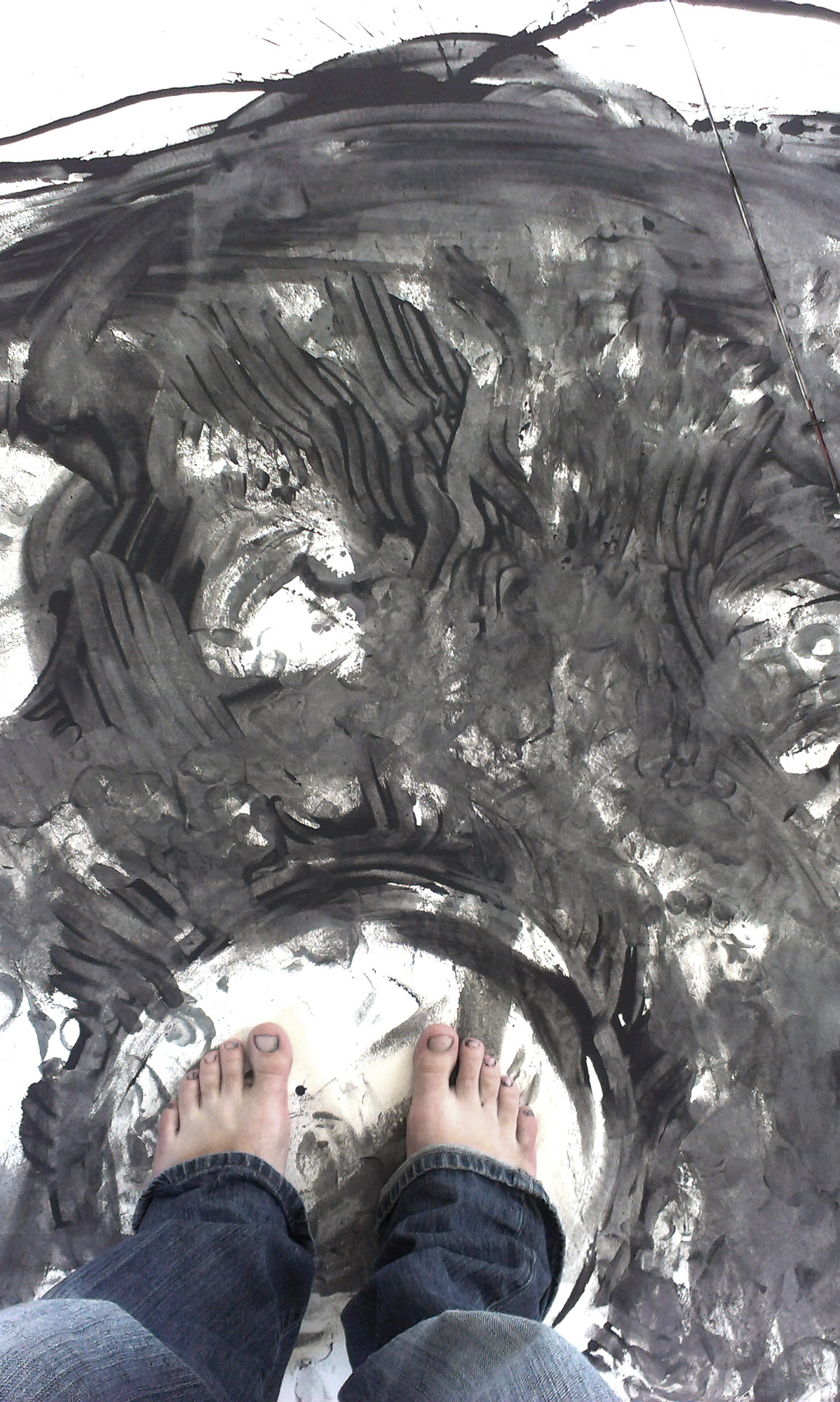 Dans la recherche d’une technique picturale appliquée à la position debout, l’effacement des traces de manière circulaire écrit petit à petit, une forme singulière.